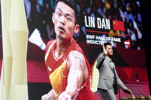 舞台上,一身灰色西装的林丹从世界羽联主席霍耶尔手中接过鲜花和名人堂纪念牌匾。