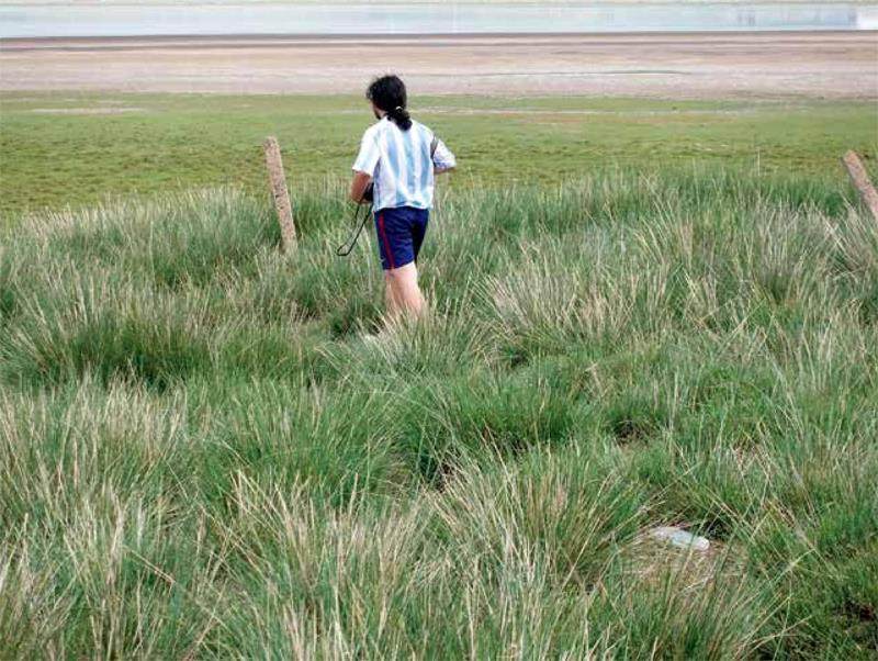 照片与照片之间的结构则依靠画面间形式或元素。画面中如脚印元素的重复、线条形式的延伸、影调色彩的衔接等,成为联结照片的桥梁。这些照片之间互相联系、遮掩,构成一个如藤蔓般的景观——一个图像世界。观者依据展板中元素和形式在这其中阅读照片,获得自身的感受进而产生各自对作品的解读。事实上,这也是如今我们通过一组照片构建现实所依赖的方式。