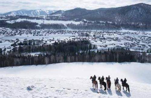 3月30日,苏卡(中)和马队队员在禾木村后山的观景平台上眺望村落。新华社记者李响摄