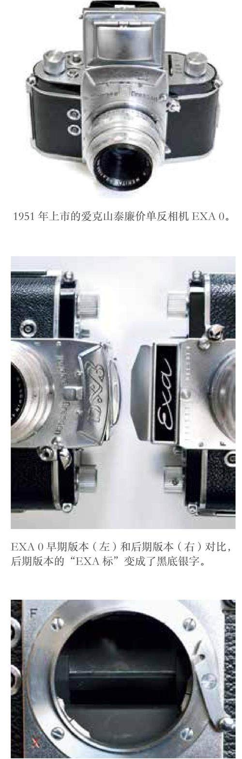 EXA于1951年上市,它的设计理念由爱克山泰135单反相机脱胎而来。也许因为它是爱克山泰135相机的简化版,因此连品牌都做了简化,只用了EXAKTA(爱克山泰)的前三个字母EXA。EXA推出后,受到市场的热烈欢迎,于是,伊哈格相机制造厂陆续生产了不同型号的EXA,形成了一个系列。为了区分EXA的不同型号,后人通常将首款EXA称为0型机,即EXA0。