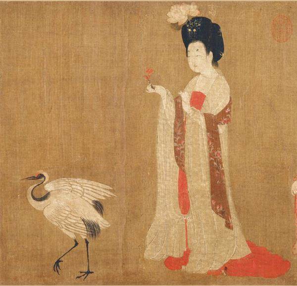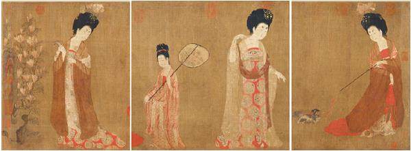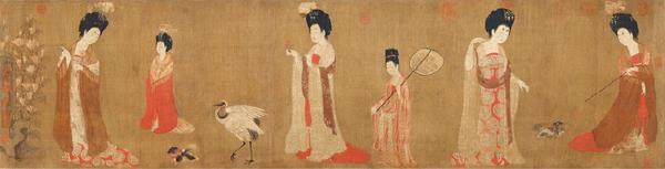 唐代周昉(约公元745一804年),出身贵族门弟,官至宣州长史,是安史之乱后最著名的人物画家。周昉此作成为举世闻名的唐代宫廷妇女生活图卷。图中女性以雍荣华贵的体态,丰满美丽的形象,在华丽的纱衣下,透着内衣的花饰,画中动物、花鸟丰富了画面,是一幅对人物神情和内心进行细致刻画的绘画珍品。