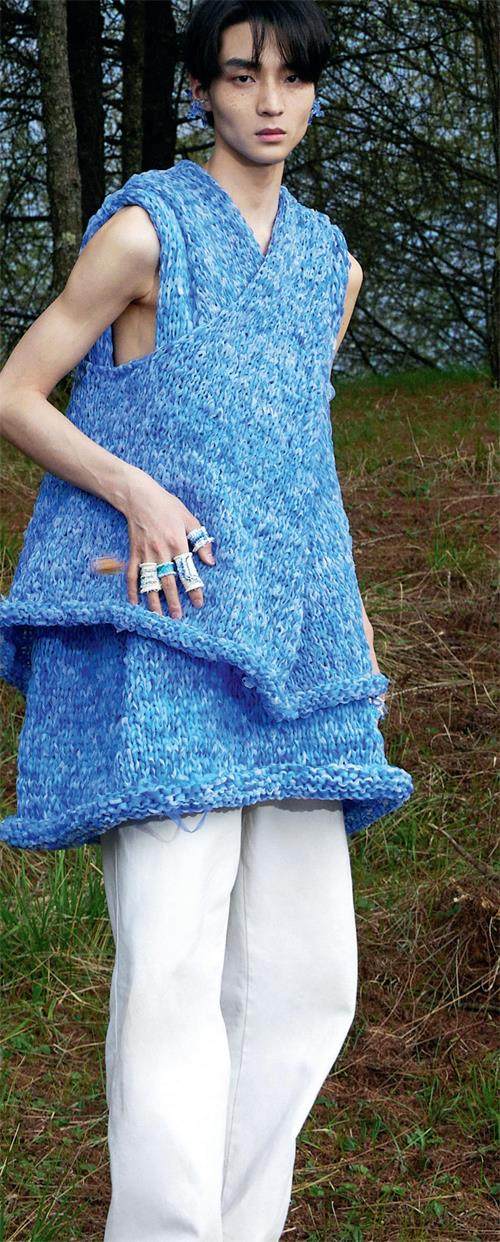 与此同时,CHENGGUANG WANG坚持细节的极致追求和把控,比如外套的内衬选择透明质地的布料,将精细的工艺展示出来;比如用编制方式将不同质地的面料组合在一起;比如用激光烧花改造我们司空见惯的面料;再比如领子下垂荡的编织带,看似随意,其实是与领部同一块面料,所以看起来好似风格突变又好似自然生长;甚至CHENGGUANGWANG在扣子的缝制上也暗藏玄机:其用穿一次线只能缝一颗扣子的方法,仅是为了首尾不打结不留线头,而这也完美体现了CHENGGUANG WANG对“强调内在,细节至上”的“偏执”。不仅如此,一般缝扣子的线迹是“=”或“×”,而CHENGGUANG WANG将线迹缝成“□”,与圆形的扣子一起,构成了外圆内方的形态。“在设计上,我以内方外圆的结构及方式,去表达我价值观里的‘外化而不内化’概念—保持自己内心的棱角,内需方;人是社会性动物需要社交,外需圆。