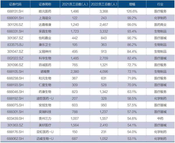 表1:A股医疗健康领域.2022年员工数量增幅前20的公司