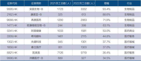 表2:港股医疗健康领域,2022年员工数量增幅前10的公司