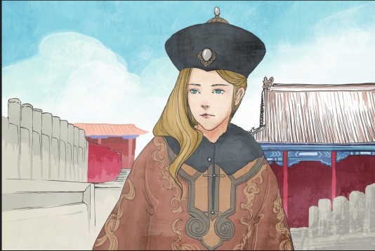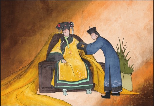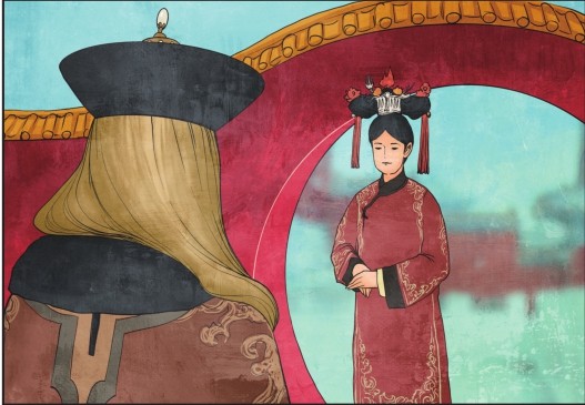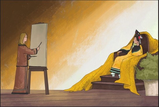 3.身穿礼服的慈禧在侍从太监的搀扶下坐上御座,与此同时宫女们为她整理衣服和头饰,卡尔则在准备自己的画架,她身旁的桌子上放着颜料、画笔、旧布、松脂、调色刀以及肖像画师职业所需的其他全部工具。
