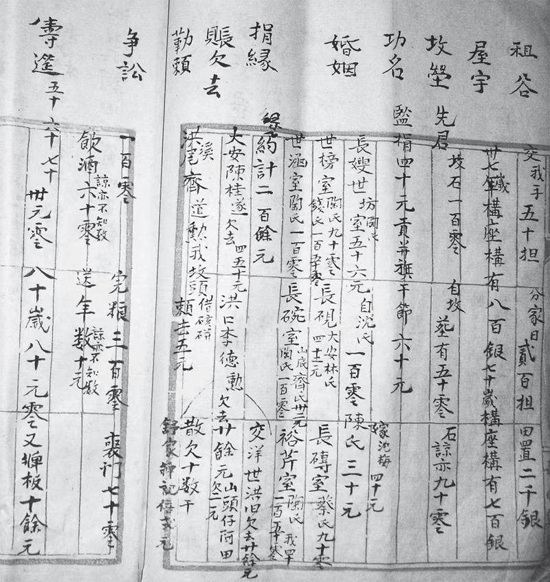 关于黄世表的身份,自传中有一段,谈及其人对一生财产与开销的自我总结,包括“租谷”“屋宇”“婚姻”等。在“租谷”部分,他写道:“交我手五十担,分家日二百担,田置二千银。”这应当是说其父交给黄世表的租谷有五十担,可能后来因其经营有方,铢积寸累,及至兄弟分家时,租谷积有二百担,并花了二千银元购置田产。另外,在“屋宇”部分,黄世表指出:他在三十七岁和七十岁时,分别花了“八百银”和“七百银”盖了房子。为父亲建造坟茔时,所用坟石花了一百零(一百多元之意,下同),为自己造坟则大概花了九十零,安葬则需要五十零。而在“婚姻”条下,他详细罗列了长兄娶妻,以及自己迎娶妻妾、儿子成亲和女儿出嫁的费用,从三十元到一百五十余元不等。此外,桑柘影斜人多扶醉,乡间还有各式各样的寺庙及会、社,所以书中还列有“捐缘”一目,其一生的花销大约在“二百余元”。除此之外的一些开支,如“争讼一百零,完粮三百零,丧门七十零,饮酒六十零,送年数十元”。在传统时代的农村,若套用《左传》中的一句古语略作改易,则“村之大事,在祀与讼”——在一定的地域空间内共同生活,闾阎鹅鸭之争在所难免,故而在日常生活中因细故兴讼的事情屡见不鲜,相应的争讼开支亦颇为可观。另外,“饮酒”和“送年”两项,应指平常及岁时的人情交际,皆注明“谅亦不知数”,说明这只是粗略的估计。自传还提及,他在五十岁、六十岁、七十岁和八十岁时分别都办过寿筵,其中的八十大寿花了将近一百元。特别值得注意的是,书中对个人功名之获得,有着明确的记载:“监捐,四十元;贡并旗干节,六十元。”由此可见,他的这个“贡元”是捐纳而来的。纳贡成功之后,通常便要在门前竖立旗杆壮其观瞻,以夸耀于乡里。对此,近人杨淡风在《永嘉风俗竹枝词》中有所解释: