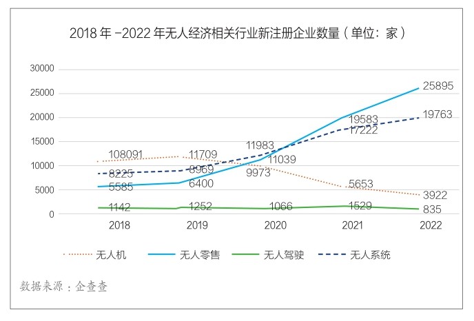 近年来,随着新一代信息技术与实体经济不断融合,无人经济进一步由生活领域向生产领域扩散,特别是随着产业数字化与数字产业化的推进,无人经济越来越多地出现在制造、物流、交通等行业领域,涌现出无人工厂、无人配送、无人驾驶等多种新业态新模式,越来越多的商家为节约成本、更好适应外部经济环境条件的变化而开启无人化经营模式。以服务机器人为例,2020年中国服务机器人销售达到222亿元,预计2023年将超过600亿元,市场处于快速扩张中。根据企查查提供的数据,2022年年底,我国与无人机相关的企业新注册数量为3922家,无人零售新注册企业数量为25895家,无人驾驶新注册企业数量为835家,无人系统新注册企业数量为19763家。