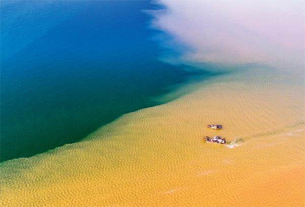 当蜿蜒5464公里的黄河东归渤海时,顿失晋陕大峡谷时的咆哮汹涌,以俯冲之姿跃入大海,幻化成一个个悦动的黄色音符,与蓝色海洋共同奏响一曲河海交响乐。
