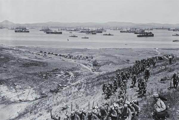 一战中的两栖作战(1914年至1918年)进入20世纪,风帆战舰向蒸汽铁甲舰过渡,登陆作战进入了钢铁蒸汽时代。1915年,英国人最早制造了舰首有登陆桥、吃水浅的比特尔号驳船,可运载500名士兵进行登陆作战,为后来两栖舰艇发展奠定了基础。这一时期,飞机的出现使登陆作战由陆海两栖开始向陆海空三栖方向发展。1917年,德军在蒙岛登陆作战中除了登陆部队外,还使用了94架飞机、6架飞艇和大量扫雷舰,最终夺得了登陆作战胜利。一战期间,共进行了数十次两栖作战,其中较大规模的有5次,4次都因遭到较强抗击而失败。1915年达达尼尔海峡战役,英法联军出动兵力48万人、战舰80艘,先后四次在土耳其加里波利半岛组织登陆,始终被压缩在5公里宽的海岸地带,主要原因是换乘导致登陆兵无法快速上岸,加之舰炮射击距离有限,不能组织海岸防御部队纵深兵力的支援。