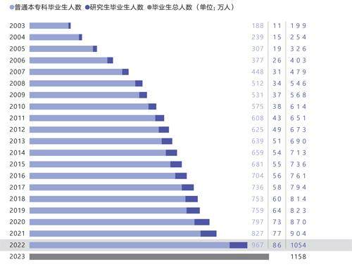中国高校应届毕业生人数在2023年达到史无前例的1158万,对比扩招后的首届(2003届)毕业生人数199万,二十几年间,中国的高等教育毛入学率从1998年的9.76%增长至2022年的59.6%,增长超过5倍,高校为社会输送的高等教育人才则累计超过1.4亿人。某种意义上,他们是伴随中国融入全球贸易体系的过程成长起来的社会中坚力量,是全球化意义上的现代公司人,也是中国城市化进程中形成的中产阶层的基本盘。