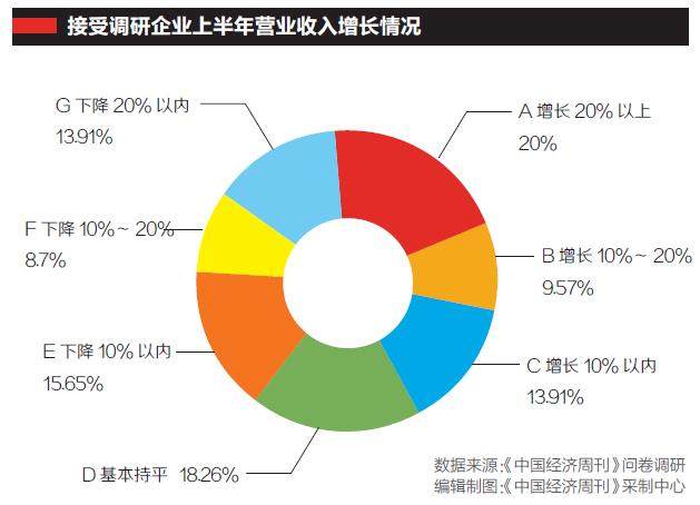 《中国经济周刊》百家企业调研数据显示,与去年同期相比,今年上半年营业收入有所增长的企业共50家,整体占比43.38%;44家企业表示上半年营业收入有所下降,整体占比38.26%;另有21家企业表示与去年同期基本持平,整体占比18.26%。