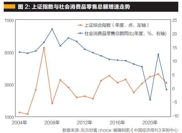 第六,从各国经济发展历史看,没有股权财富的增长,就不可能有效扩大中产阶级队伍,就不可能实现内需结构的重大调整,更谈不上消费拉动的可持续增长。实际上,国民财务健康与消费拉动相辅相成。如果在资产负债表恶化的状态下拉动消费,只能适得其反。非要强行拉动消费,国民的资产负债率会不断恶化,严重消耗经济增长潜力。我们现在是不是正在犯着这样的错误?从图2我们可以看出,A股市场的涨跌和社会消费品零售总额的增速之间,多少还是存在一定的正相关性关系的。