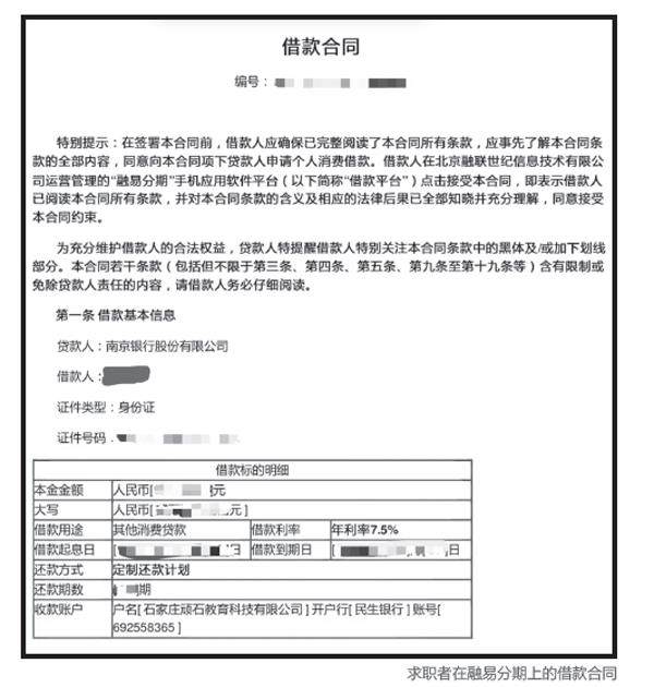 “他们让我提供银行卡,实际是用来在‘融易分期’的APP上办理贷款,”林希说,“公司的工作人员在旁边指导我办理申请,里面有很多合同都没来得及看,对方直接让我略过,整个贷款流程几分钟就办完了。”