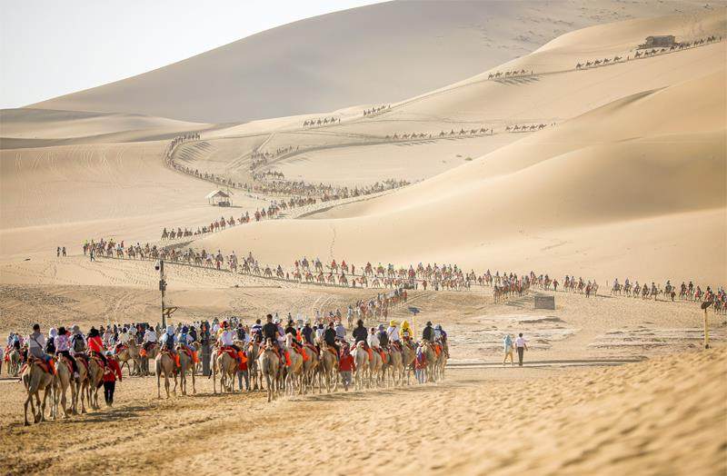 7月5日,甘肃酒泉,敦煌鸣沙山月牙泉景区,游客骑乘骆驼感受大漠风光。