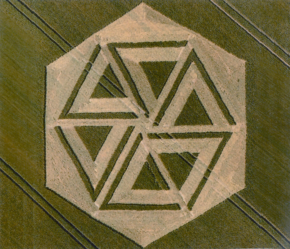 7月9日,在维尔特郡的佛洛克斯菲尔德的麦田里出现了怪圈。在直径大约44米的六边形圈内,6个三角形组成了立体的几何方框。有趣的是,在这6个三角形的“方向”上,不知为何只有下面的三角形是反方向的。换句话说,只有右下角的两个三角形是“封闭”的。这其中究竟包含着怎样的含义呢?(未完待续)