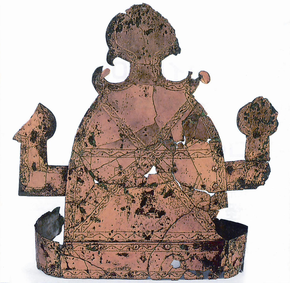 前文提到的大加耶池山洞古墓群的32号墓中,出土的金铜冠是公元5世纪中叶的产物,半圆形板的左右和上部均留有用铆钉固定着的宝珠形的装饰,整体被施以精细的刻金。由于王冠只能覆盖额头,因此被称作额饰式。