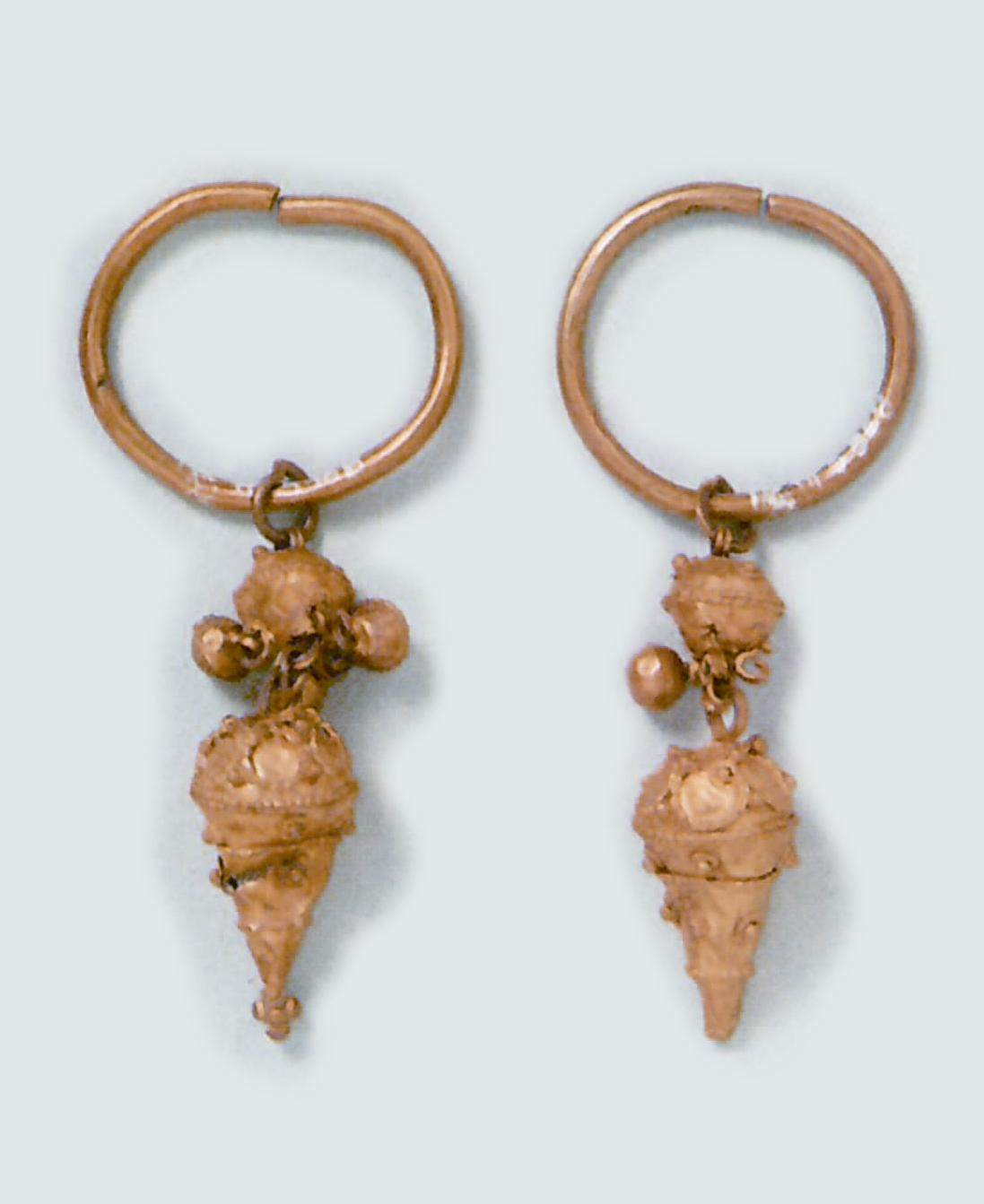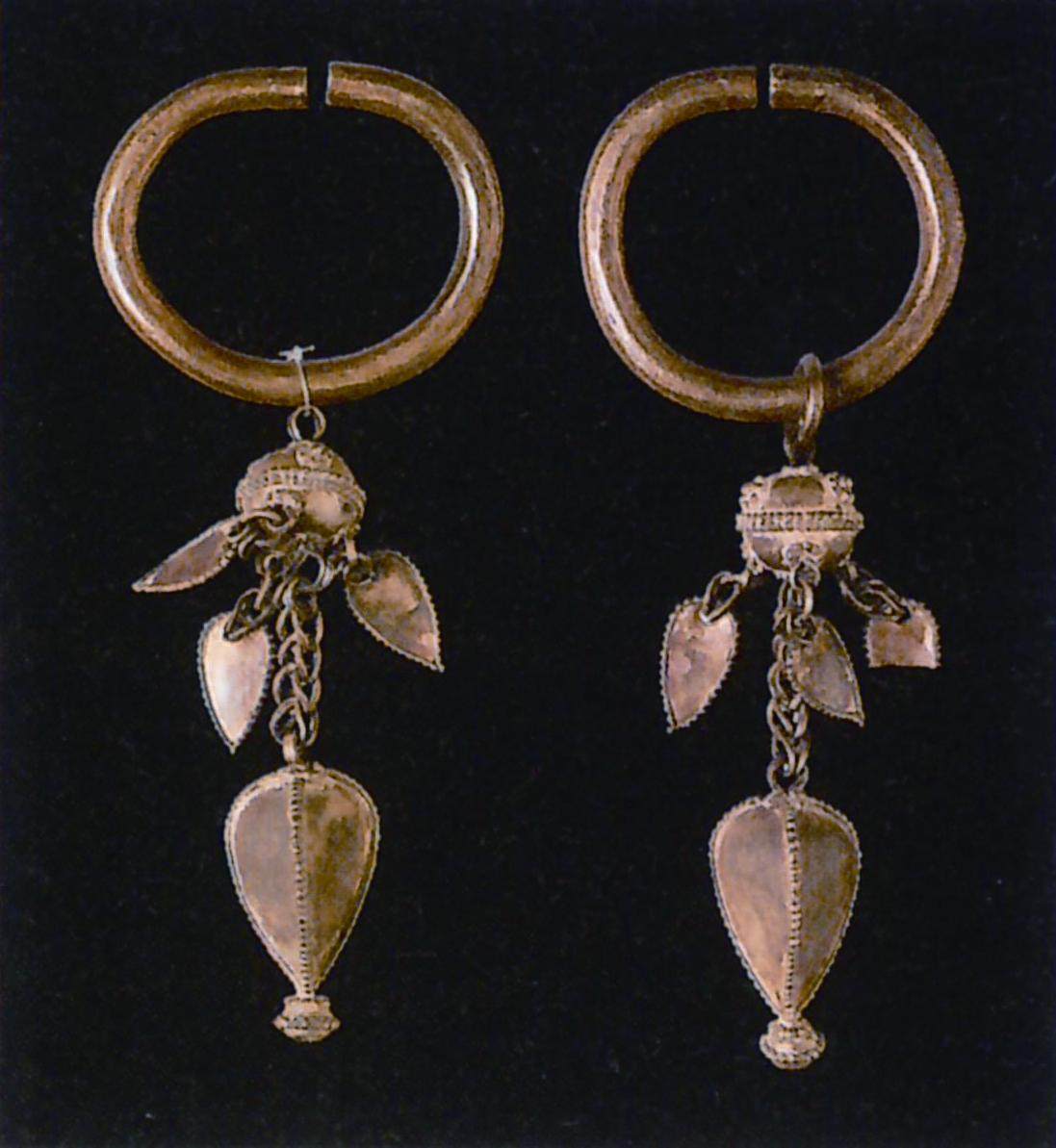 从耳朵下方垂下来的华丽垂饰耳环,作为基本的装饰品,在古代朝鲜社会是十分常见的,且大部分的装饰品都是金制的。大加耶系的垂饰耳环多用锁链,以空球作为中间装饰。在公元5世纪,十分流行类似钓具浮漂一样形状的垂饰。进入公元6世纪,开始流行类似栀子种子形状的垂饰。