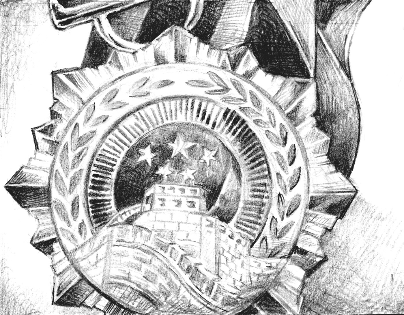 2.尹淼娓娓道来:“‘两弹一星功勋奖章’直径8厘米,用纯度为99.9%的黄金铸造,重515克,配有绶带。奖章图案由五星、长城、橄榄枝和光芒线组成:五星代表中华人民共和国;长城既象征着中华民族坚强不屈的精神,又象征着共和国坚不可摧的国防;橄榄枝则表明我国研制‘两弹一星’的目的是为了维护世界和平……”