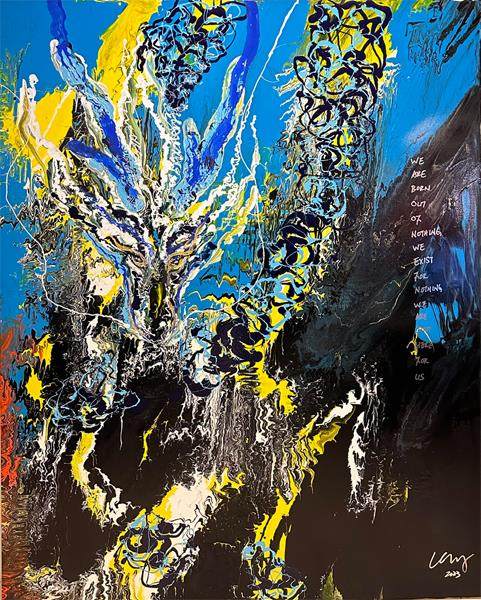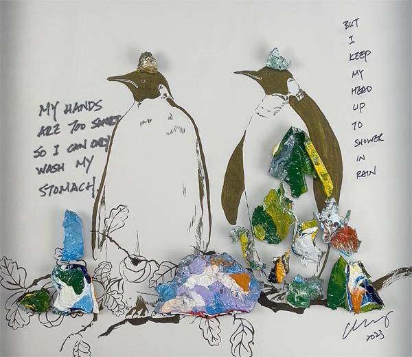 蒋友柏早年学金融专业,后来转型做设计,近些年投身于艺术创作,是什么契机让他进入艺术领域的? 他认为这是一个时间性的问题。在不同的时间,就会有不同的身份。年轻时,想要在世界中,争自己的位子。年纪大了一点,就想要在这世界中留下一些什么。现在,小孩也都成年了,反而,想要为自己而活。这就是身份自然转变的原因。不论是何种身份角色,“对于美,是自小就有的喜好。对于诚实活,是40岁后的坚持”。并且,创作艺术时,对他来说是一个自我疗癒的过程。艺术家这个身份,给他带来的最大乐趣是“与自己对话、与有趣的人互动。”在蒋友柏的艺术作品中,常见动物、山、水,在他日常生活中,喜欢以“走路”的方式,去亲近感知大自然。“因为能够到处逛,随意逛,慢慢晃,是一种奢侈。但是否会刻意接近自然? 那到不会。因为自然就在平时的观察中。想要,哪里都可以看到自然。”然而,人类在追求现代都市建设发展时也影响了与大自然之间的关系,蒋友柏也“希望以我的作品为框,让观者用自己的体验,来想像、感受……”他认为同理心与想像力是很重要的两种能力。本次在無集画廊展出的作品标签中,看到蒋友柏为每件作品写了诗句,“每次的启程飞行,我们都会放下一段过去,并捡起一片未来”,“透过缝隙,看到世界的另一面”,颇有意趣,而诗句与作品的诞生前后顺序,似乎是先有母鸡还是先有蛋的世纪难题。“产生诗句与作品的灵感先后顺序真的无法分清,有时诗会告诉我要如何画。有时候画中的动物会告诉我他想要说什么? 一切,就是自然的发生。”蒋友柏希望更多人能够会心一笑。然后想像自己的美好。喜怒哀乐,只要诚实面对,就会美好。