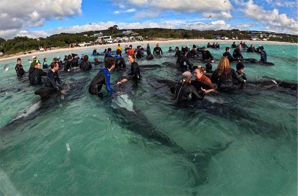 当地时间2023年7月26日,澳大利亚奥尔巴尼,在东部的Cheynes海滩,近100头鲸鱼搁浅后,救援人员正在照顾一头长鳍领航鲸。志愿者们在第二天持续工作,紧急营救数十头搁浅的领航鲸,但已有50多头领航鲸死亡。