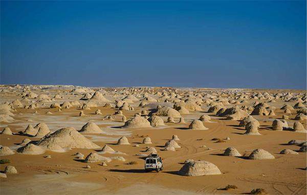 当地时间2023年4月13日,埃及,位于埃及西部的“黑白沙漠”是撒哈拉沙漠中法拉弗拉洼地的一部分。这片广阔的沙漠里有连接利比亚和埃及边境的主要道路。数百万年形成的喀斯特石灰岩自然景观,让人仿佛置身于宇宙中的神秘星系。