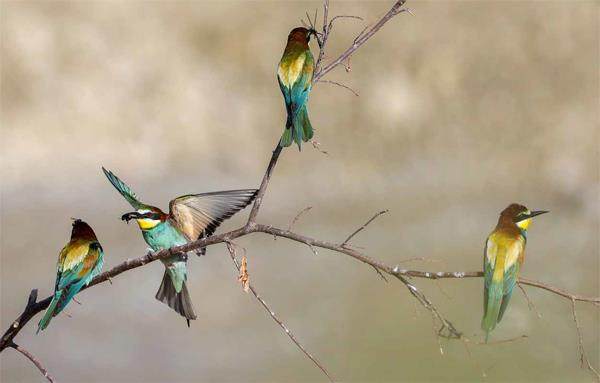 當地时间2023年7月22日,德国巴登-符腾堡,食蜂鸟(Merops apiaster)栖息在树枝上,嘴里叼着大黄蜂和蜻蜓。除了蜜蜂,食蜂鸟还捕食许多其他的飞虫。它们在冬天迁徙到非洲南部。因为色彩斑斓的羽毛,它们成了德国最美丽的鸟类之一。