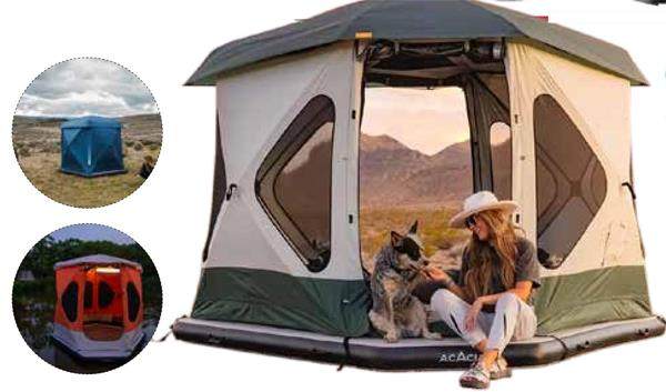 此帐篷旨在为你提供舒适的户外露营空间,是一款随时准备冒险的帐篷。它的启动设置可以在20分钟内完成。打开后,帐篷会弹出两侧和上部屋顶,同时,与地面接触的气垫开始膨胀,整体结构建立完成。帐篷的结构与充气皮划艇相似,坚固耐用,能够承受高达1814千克的压力。帐篷的地面气垫防水防潮,可漂浮在水面上。300D牛津面料可以抵御高达40米/小时的风速和2000毫米的雨量。通风结构使气流快速流动,当处于低温环境时,帐内温度也可以保持高于室外12℃的温度。