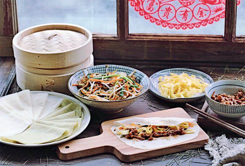 可惜这手艺我没有传承下来,我的手一遇到胶黏的面糊就无所适从,试过几次只得放弃。母亲做单饼最拿手,说是单饼,其实要成双成对地烙,把两个面饼合在一起,中间抹油,擀成更薄的饼,烙熟后轻轻揭开,软软的、热热的,柔韧熨帖,平铺于圆盘中,卷着菜吃。一般卷炒土豆丝、炒豆芽,那时候真没别的什么好吃的,若逢节日可以有一盘韭菜炒鸡蛋;也有喜好葱酱的,抹上酱打底,铺一层土豆丝,放上两条绿莹莹的葱叶,好看的香菜也可以撒一些。从前我以为这个吃法本就是跟肉没关系的,后来才知道那时候肉是稀罕物,直到经济条件好一些,实现吃鸡蛋自由了,才开始用酱炒蛋,高级了很多。
