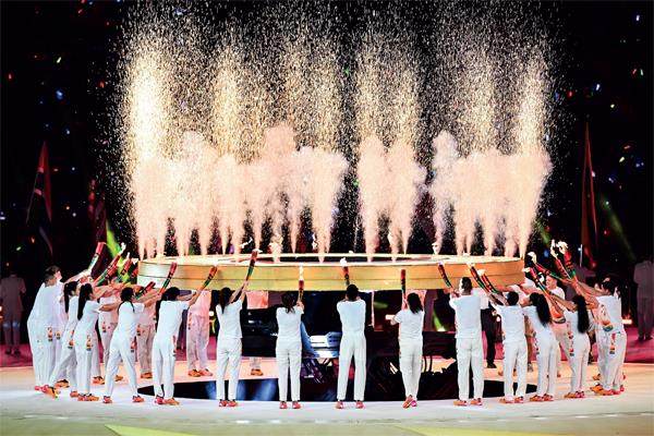 由川籍航天员叶光富领队,31名火炬手一同点燃太阳神鸟火炬盘,光芒直射到空中30米,12道烟火引发体育场顶棚一圈的节日烟火,如一只神鸟穿梭过200米的烟火长廊,点燃了主火炬塔熊熊燃烧的圣火。