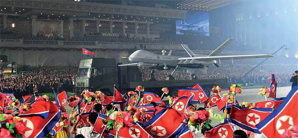相较于今年2月的阅兵式,这次阅兵式是规模更大的一次新型武器展示。除了“火星炮-17”洲际弹道导弹,以及刚刚试射成功的“火星炮-18”固体燃料洲际导弹外,最为外界瞩目的是,阅兵式正式开始前,两款全新的大型中远程无人机在阅兵广场盘旋表演,“给一代接一代庆祝主体朝鲜的胜利和光荣的7·27的人民增添了一份欢喜”。