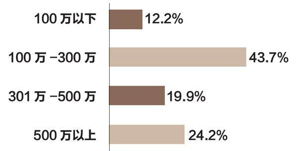 据调查,在城镇生活的人对于“安心退休”所需要的存款认知相差不远,43.7%的调查对象都选择了“100万-300万”。