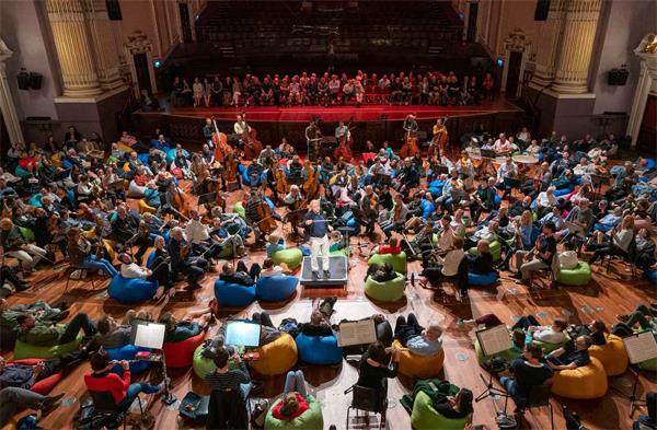 当地时间2023年8月8日,英国爱丁堡,在爱丁堡国际艺术节音乐会上,观众们被邀请坐在音乐家们中间的豆袋沙发上,这是今年音乐节上展示古典音乐的新方式之一。