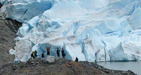 当地时间2023年6月8日,美国阿拉斯加州,一群人欣赏门登霍尔冰川的景色。夏季可以乘坐皮划艇或独木舟,沿着小径步行或乘坐直升机到达冰川。随着门登霍尔冰川继续消融,游客们纷纷涌入此地,預计今年的游客数量将创纪录。