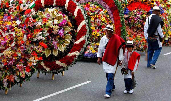 当地时间2023年8月7日,哥伦比亚麦德林鲜花节盛大开幕,当地人在传统的花车前走过。