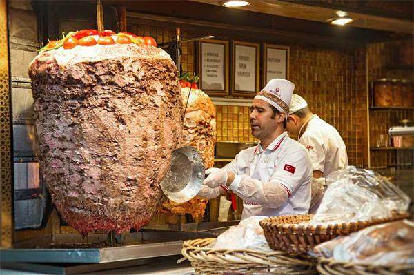 将腌制过的牛羊肉制成烤肉柱加以烤制,这种烹饪方式在土耳其、希腊等国有着悠久的历史传统和丰富的实操经验。早在1836年,普鲁士名将老毛奇在奥斯曼帝国工作期间就曾在日记中记录,“我们吃到了颇具土耳其风味的午餐。用发酵面饼卷上烤制的羊肉,实在是一道佳肴”。历史演进中,土耳其各地的厨师们不断对烤肉的烹饪方法加以改良和创新,从水平烤制到在垂直烤架上烤制,从配米饭到配大饼,配料越加越足,烹饪方式也与今天柏林街头巷尾Döner饼的做法愈加接近。但总体上,烤肉仍是土耳其人餐厅当中的一道“讲究菜”,并未“走下庙堂”。土耳其烤肉饼风靡全欧则要另从它的德国之行讲起。