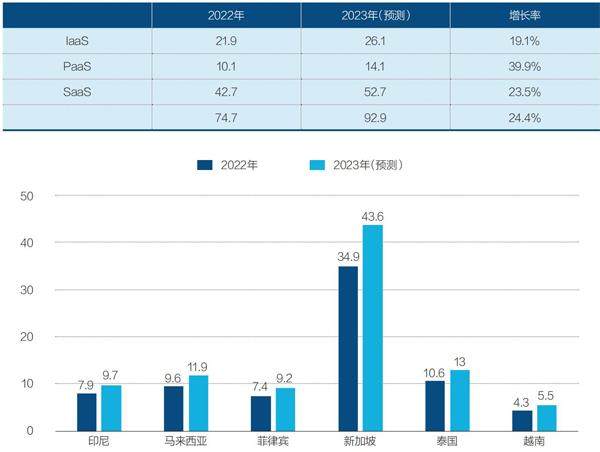 国际市场调研机构IDC亚太向《财经》提供了一组数据,2022年东南亚公有云(IaaS、PaaS、SaaS)市场总和为74.7亿美元。其中,新加坡市场最大,为34.9亿美元,泰国为第二大市场(10.6亿美元)、接下来的是分别是马来西亚9.6亿美元、印尼7.9亿美元、菲律宾7.4亿美元、越南4.3亿美元。