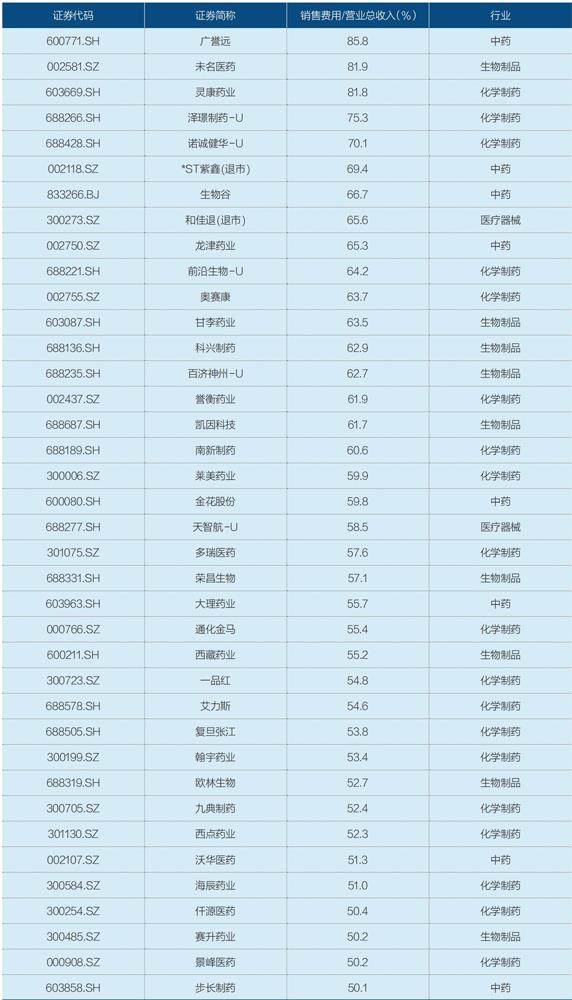 表1:销售费用占营业收入比例超过50%的A股医疗企业