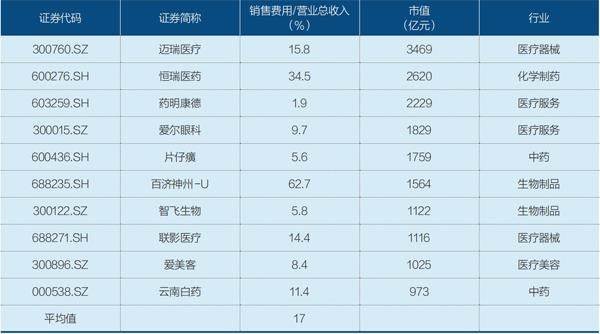 表2:市值前十的医疗股,销售费用占比多少?