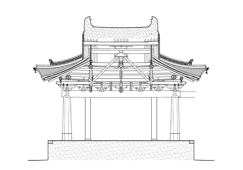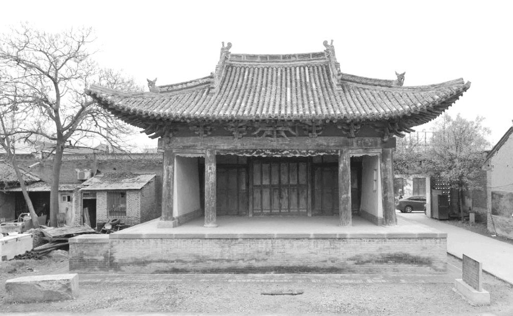 董村戏台元代已建,虽经历代修葺,元代建筑特征仍十分明显。前檐明间柱进行移柱,并于其上使用大檐额承重,斗拱用材较大,屋顶举折较缓,其梁架设计大胆,结构精巧,不设大梁,各个构件相互结合、相互作用,在适应内部结构的性能和实际用途需要的同时,优美的屋面弧线、比例得当的外观,充分反映出古代匠人对力学结构的巧妙运用。
