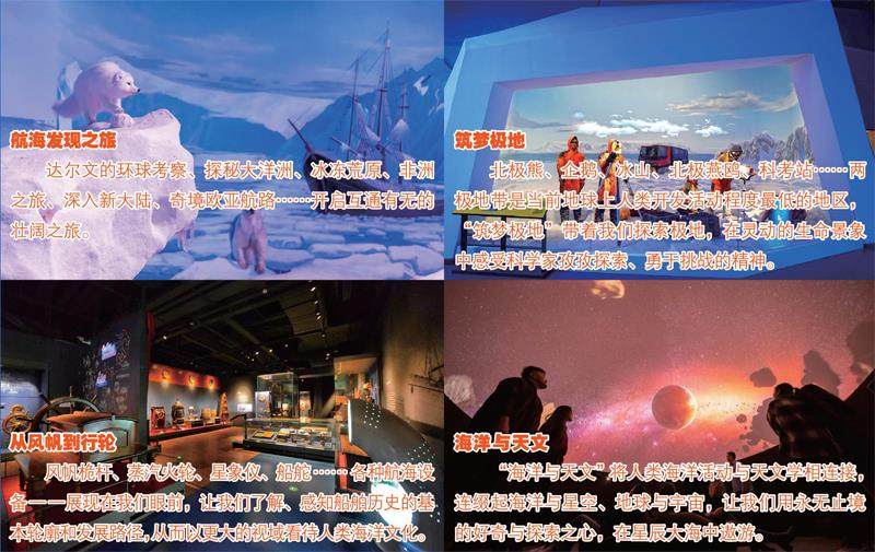 国家海洋博物馆是我国唯一的国家级综合性海洋博物馆。国家海洋博物馆展厅面积2.3 万平方米,通过6 大展区、15 个展厅和3.6 万余件珍贵藏品,全面展现了自然生态、历史人文、科学技术等多维视角下人类与海洋相互依存、和谐共生的密切关系。