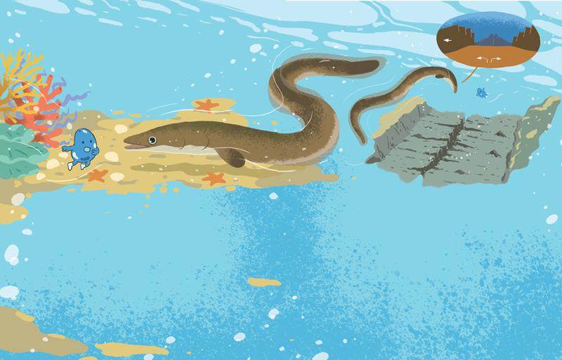 这天,正当小水滴在海里漂流时,一条貌似海蛇的生物扭动着细长的身体,在海中穿梭着。眼看它逐渐远离自己,小水滴急忙大喊:“海蛇大哥,你这是要去哪里呀?”那个奇怪的生物听到了小水滴的声音后,放慢了速度,缓缓地向小水滴靠近,上下打量着小水滴,不满地说:“第一,我不是什么海蛇,海蛇是爬行动物,我是欧洲鳗鲡(mán lí),是鱼类!第二,我不是‘大哥’,我是雌性!”听完它的话之后,小水滴赶忙道歉:“太不好意思了,鳗鲡……姐姐!”看小水滴一脸真诚,欧洲鳗鲡倒也没往心里去。