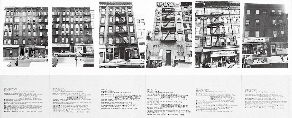 调研不仅充实了艺术作品,还成为其内容的重要组成部分。德国艺术家汉斯·哈克(Hans Haacke,1936— )就曾将纽约郡办公室的档案记录融入自己關于曼哈顿地产考察的作品中。这部作品只是在展示事实,由142张建筑物和空地照片、下东区和哈莱姆区地图以及关于所有权变更、地价与抵押贷款方信息的文本和图表组成。