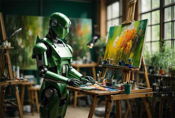 机器人拿着画笔站在画架前进行创作,画由人工智能生成。该图意在说明,机器人已经具备了像艺术家那样作画的能力。