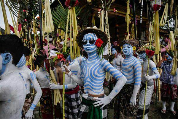 當地时间2023年9月6日,印尼巴厘岛,脸上和身上涂有彩绘的巴厘岛人在村里祈祷和游行,完成一种被当地人视为“驱邪避凶”的仪式。