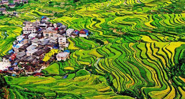 2023年9月6日,广西柳州,融水苗族自治县杆洞乡梯田上的丰收景色。