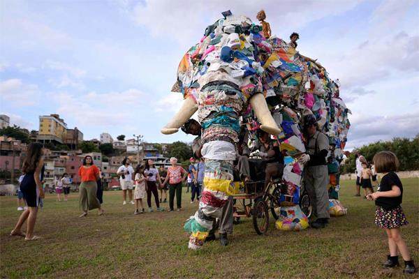 当地时间2023年9月2日,巴西贝洛奥里藏特,戏剧团体的成员参加“大象剧院”街头表演,他们用重达200公斤的废品制作了一个巨型大象木偶。这次街头表演旨在打破对流动人口的刻板印象。
