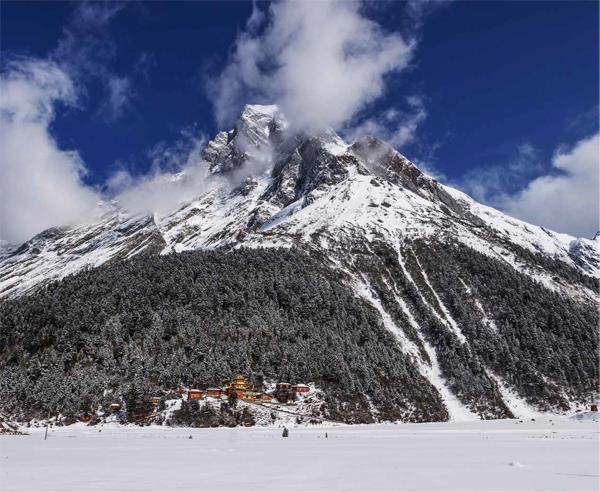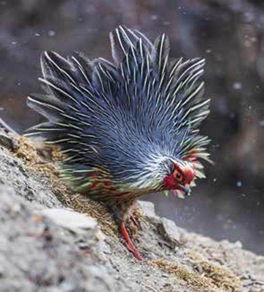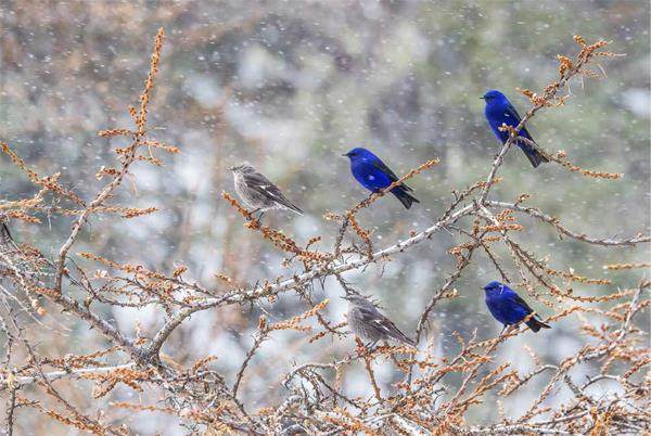 从墨脱出来,越野车又一次翻过大雪覆盖的垭口,在雪山下的嘎隆拉寺注视下,我们向著波密方向驶去。灰蒙蒙的天空中开始飘雪,不久下得越来越大。这时,视野中出现了一团黑影,快速移动着。“蓝大翅鸲!”我惊呆了,正是那些有着令人眩目的蓝色羽毛的精灵。漫天飞舞的除了雪花,还有蓝大翅鸲,几百只如同一阵蓝色旋风,在头顶的天空上掠过。这些高原上的“游牧民族”冬季迁到低海拔区,结群活动。它们行动一致,齐刷刷落在松树上,间隔均匀地站立,犹如圣诞树上的蓝色挂饰,藏民亲切地称呼它们“喜玛拉雅蓝鸟”。我注意到附近有沙棘树,沙棘果是冬季蓝大翅鸲最喜爱的食物,它们是在这里觅食。