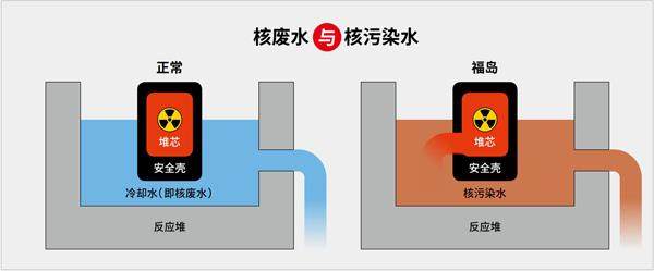 福岛第一核电站使用的是美国通用电气设计的沸水反应堆。这类反应堆通过铀燃料核裂变释放热量,把水加热为蒸汽,从而驱动涡轮机来发电。一般情况下,核电站的冷却水是在密封的燃料棒外面循环,并不直接接触核燃料。但福岛核电站堆芯熔毁后,熔化的高温核燃料留在反应堆里。如果不对其进行冷却,它们将会直接渗入地下而造成更大的灾难。因此,东电必须持续向安全壳内注水对核燃料进行降温。这些直接接触堆芯的冷却水、反应堆原有的冷却剂、大量渗入反应堆的地下水及雨水等全都携带有大量核辐射物质,被称为“核污染水”。
