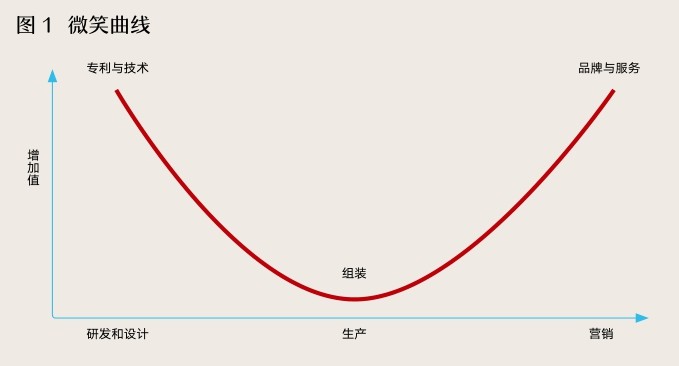 微笑曲线一直被人们广泛使用(图1)。就制造的供应链而言,它往往用来表明供应链两端增加值最高,而中间的增加值则最低。这根曲线,经常会被用来证明全球工业化的分工差别导致的价值链高低,而且也暗示了不同企业各守其位的合理性。