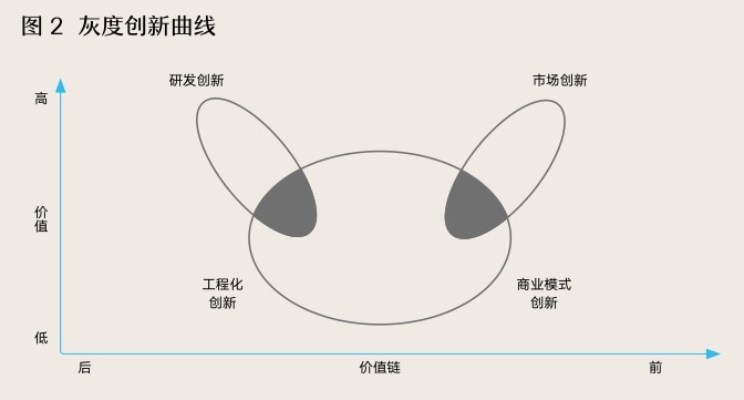 这条简单明了的线条,无意之中忽略了供应链的复杂性。制造远比这种简单的价值分工要复杂得多。中国供应链有着更强的聚合效应,尤其是企业之间的接合部。大量创新,其实是由制造工厂与上游供应商,或者下游用户联合完成的。这种围绕着生产制造与其技术研发上游、市场营销下游等不同价值创造阶段交叉结合之处而产生的创新,可以称之为“灰度创新”,包括工程创新或工艺创新,以及商业模式创新或服务创新。由于发生在企业之间接合部的交叉地带,双方都注入了各自的知识养分。知识产权一开始很难认定,因而呈现了灰度特征,这使得它的创新价值贡献容易被忽略。换言之,一个制造企业需要通过知识交换,与它的外部组织之间的交集互动部位,形成一个供应链层面的特殊开放式创新(open innovation)(图2)。